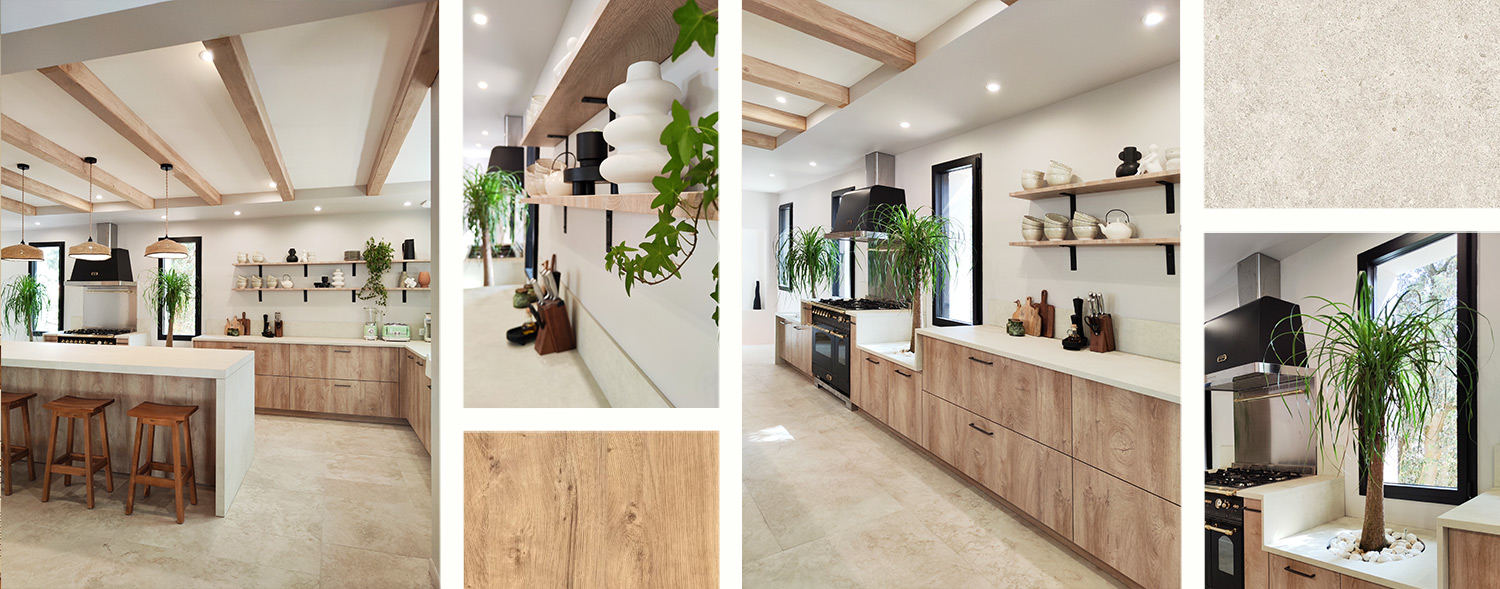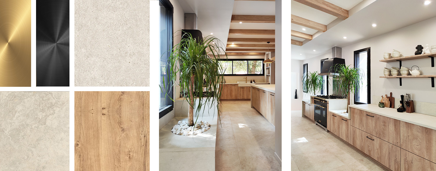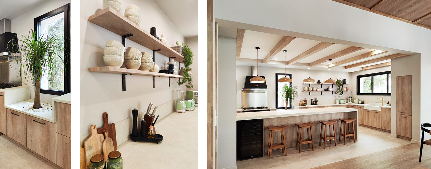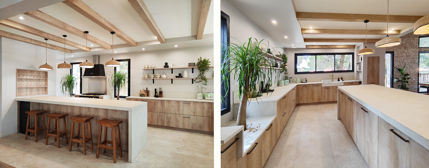 vue d'une grande cuisine dans un esprit nature et zen, avec du bois pour les façades et du béton pour le plan de travail. un sol en travertin