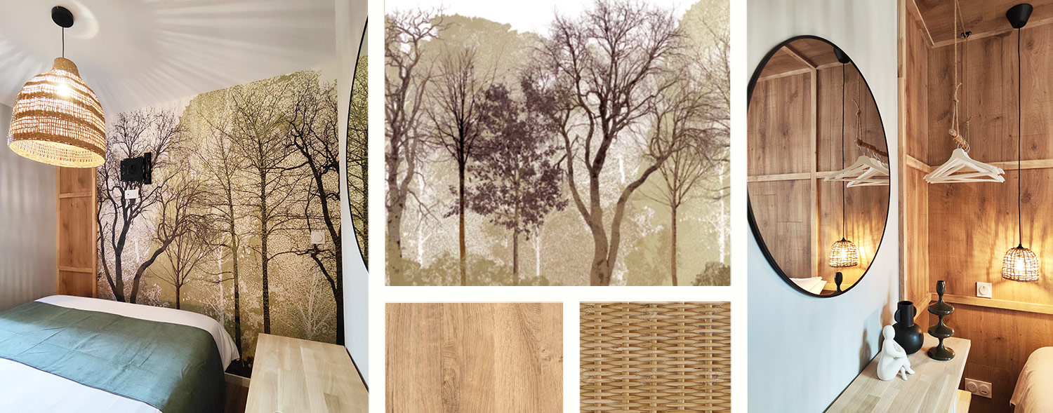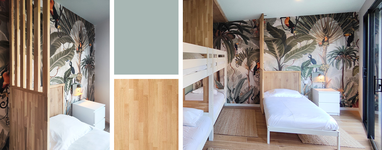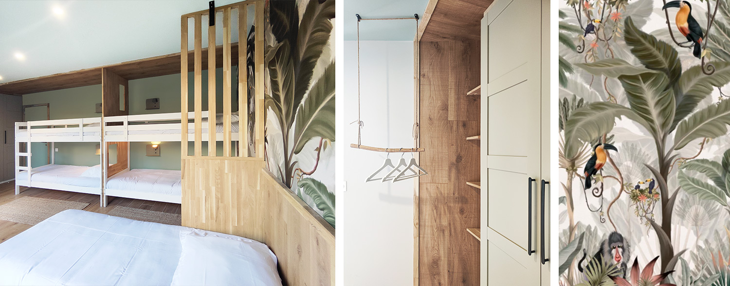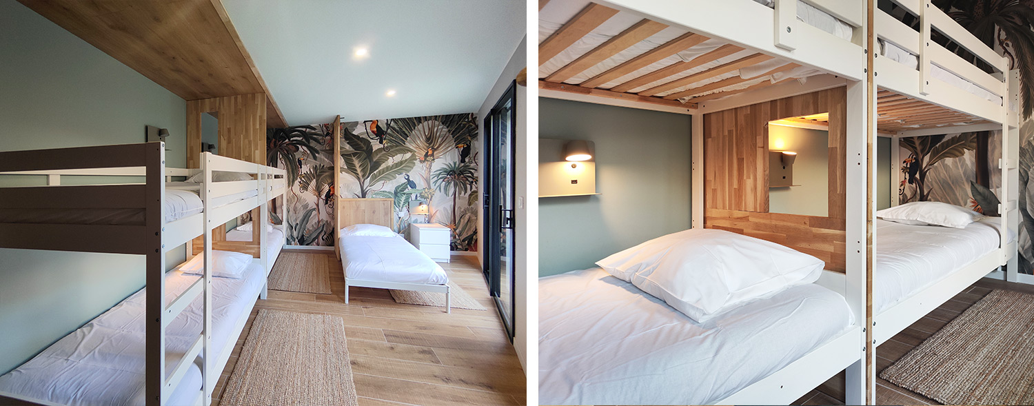 Au rez-de-chaussée, l’entrée dessert cinq chambres doubles avec salle d’eau ainsi qu’un dortoir enfant. Chaque chambre bénéficie d’un papier peint panoramique Photowall différent. Toutefois, tous restent dans une ambiance naturelle et apaisante. Ainsi, ces espaces offrent confort et convivialité. Ils conviennent parfaitement aux familles nombreuses ou aux groupes d’amis.