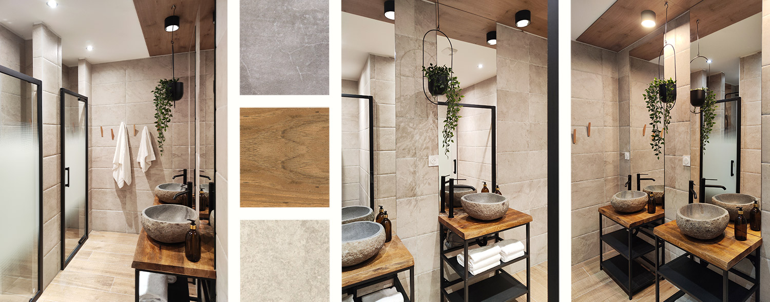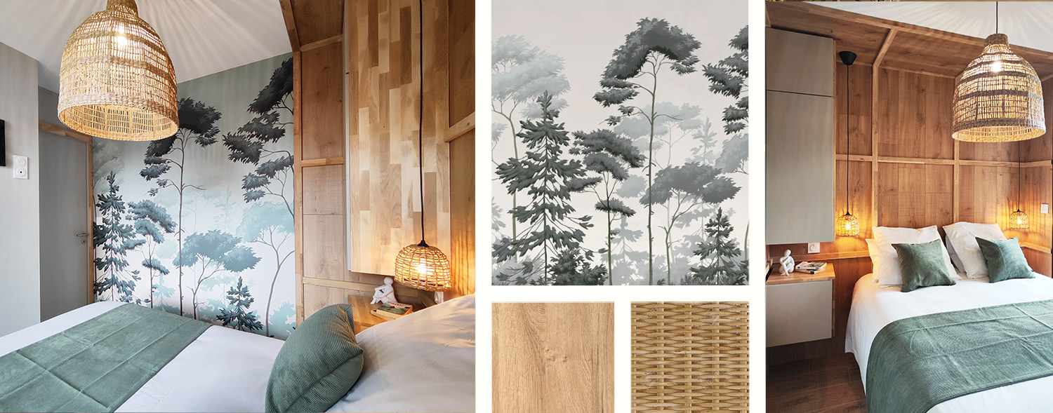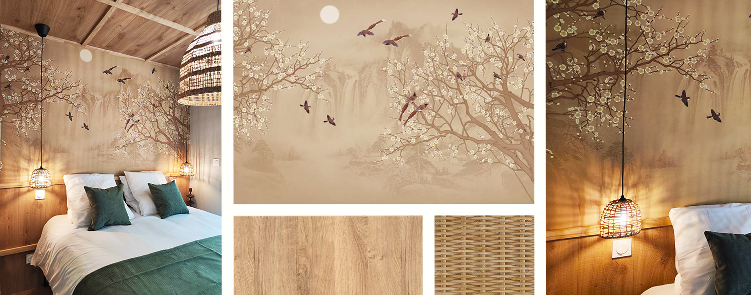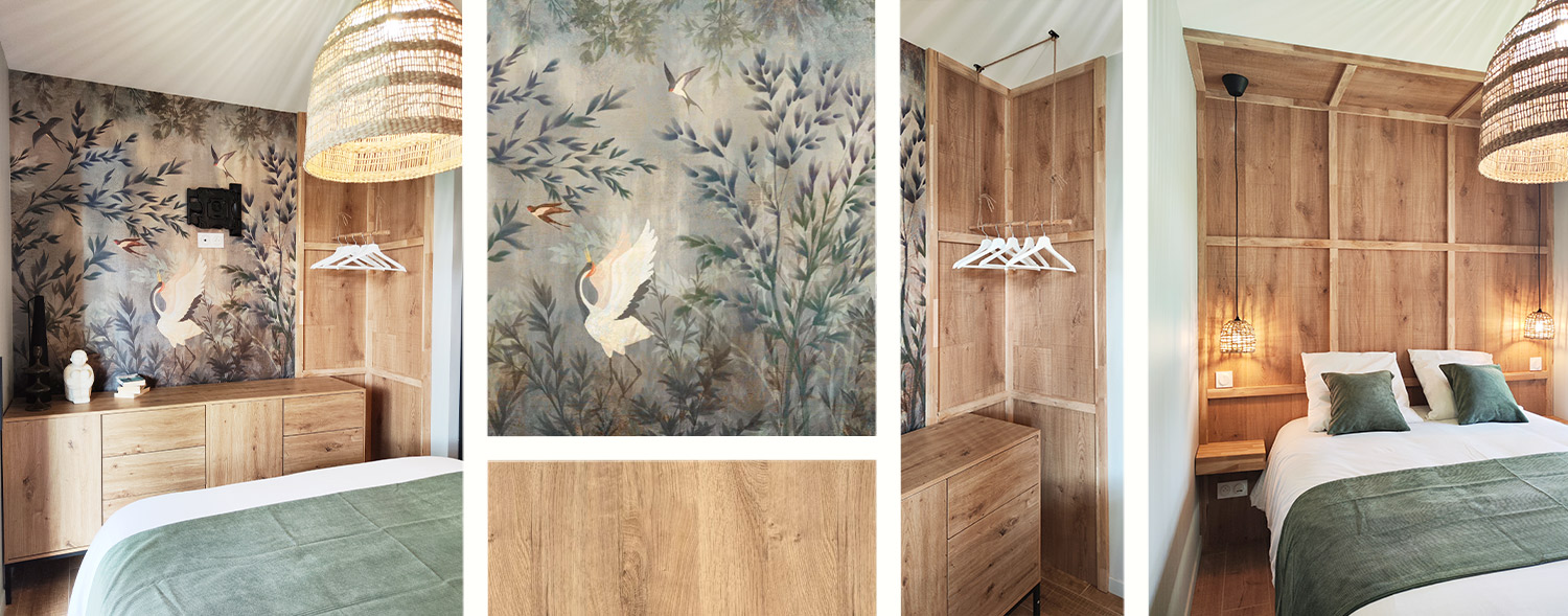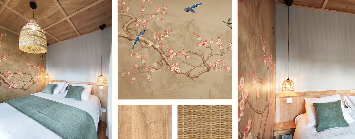 Au rez-de-chaussée, l’entrée dessert cinq chambres doubles avec salle d’eau ainsi qu’un dortoir enfant. Chaque chambre bénéficie d’un papier peint panoramique Photowall différent. Toutefois, tous restent dans une ambiance naturelle et apaisante. Ainsi, ces espaces offrent confort et convivialité. Ils conviennent parfaitement aux familles nombreuses ou aux groupes d’amis.