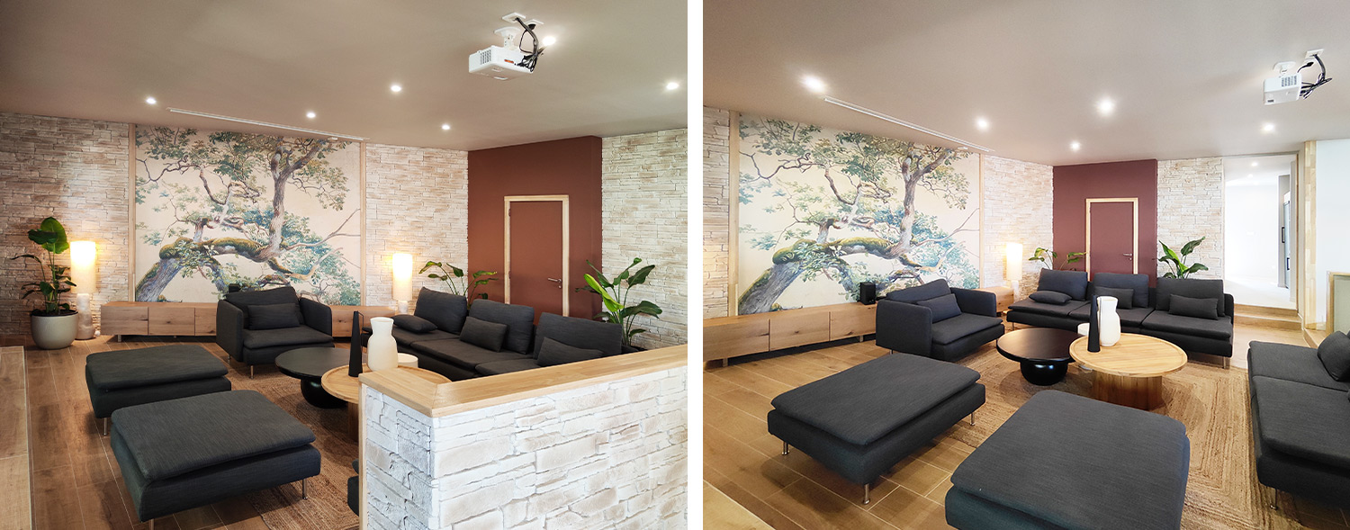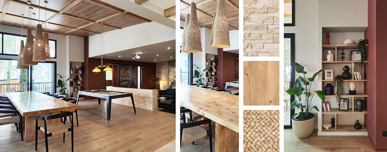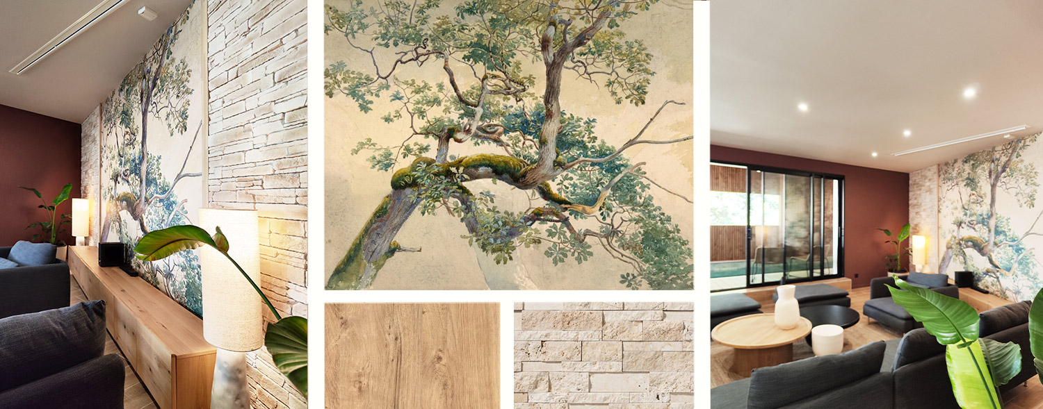 À l’étage, la maison offre une vaste pièce de vie lumineuse. Les sols mêlent bois chaleureux et travertin. Les murs sont décorés de papiers peints panoramiques aux motifs nature. Ces derniers, associés aux des teintes du nuancier Chromatic CH2 0924 Bruns Troms et EN.02.78 de Sikkens. L’ensemble créant une ambiance calme et harmonieuse. Un parement en pierre naturelle ajoute de la texture et du charme.