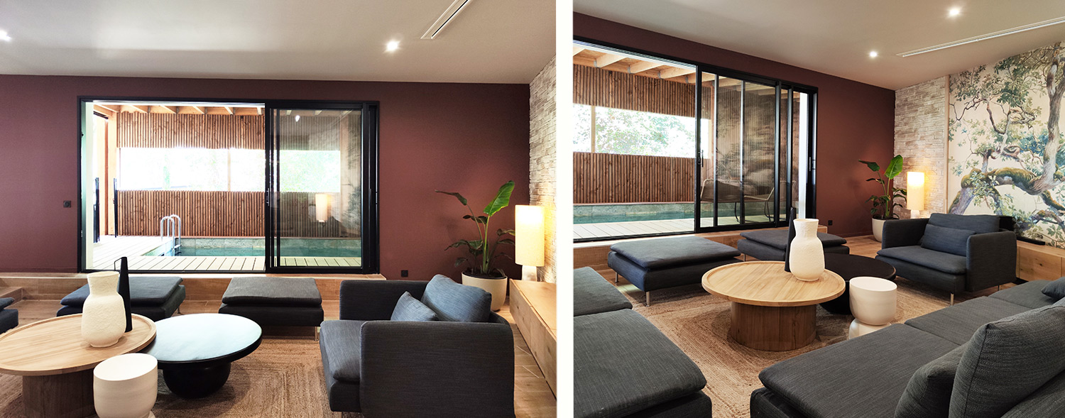 En contrebas, un salon cosy s’ouvre sur la terrasse et la piscine grâce à de larges baies vitrées. Cela invite à la détente dans un cadre naturel.