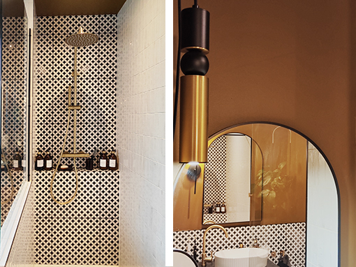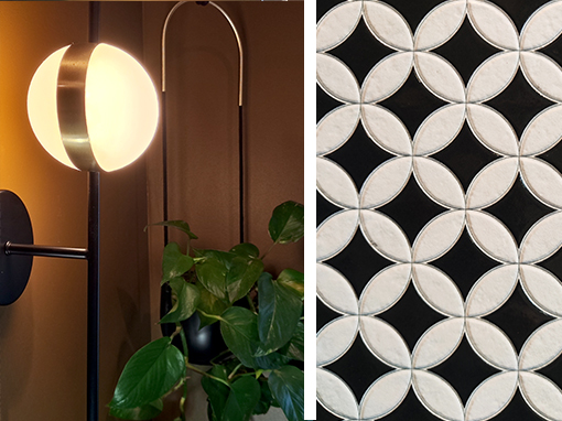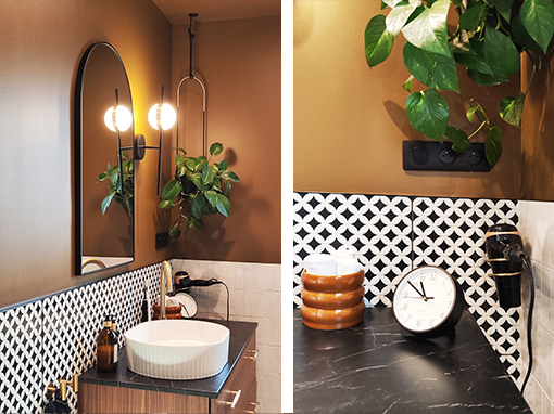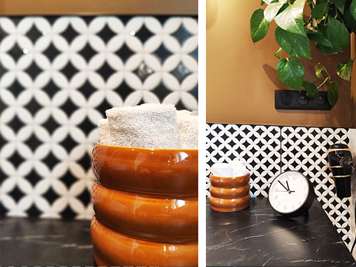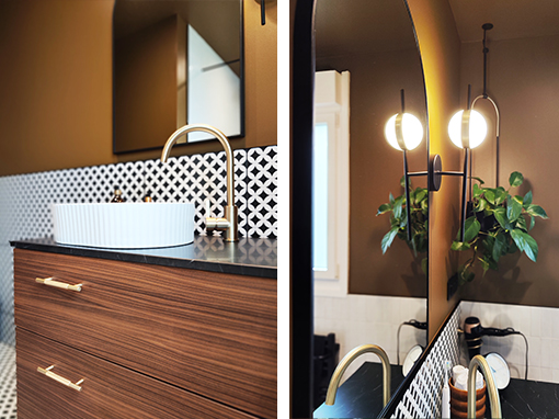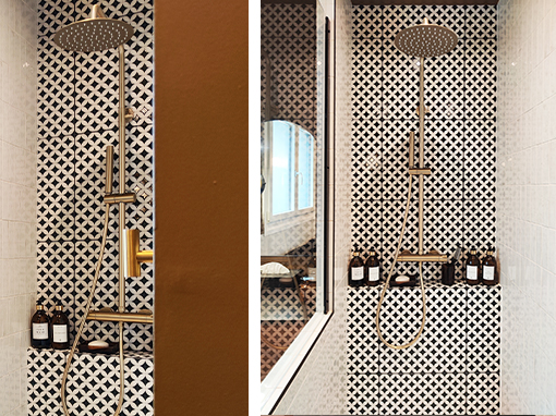 Notamment, le carrelage pétale noir et blanc ORLY apporte un élément graphique marquant, structurant l’espace et affirmant l’identité de la salle de bain.